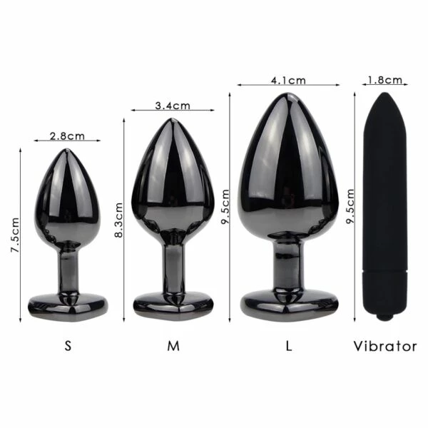 PleasureStore has launched this mindblowing 3 Piece Gun Metal Grey Precious Metal with Red Rhinestone Jeweled Butt Plug and a 10-speed Black Bullet Vibrator Set to take your pleasure higher than ever!