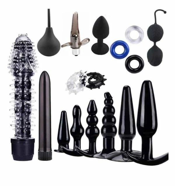 Sex toy kit with vibrators, anal toys, cock rings and more for adventurous bedroom fun