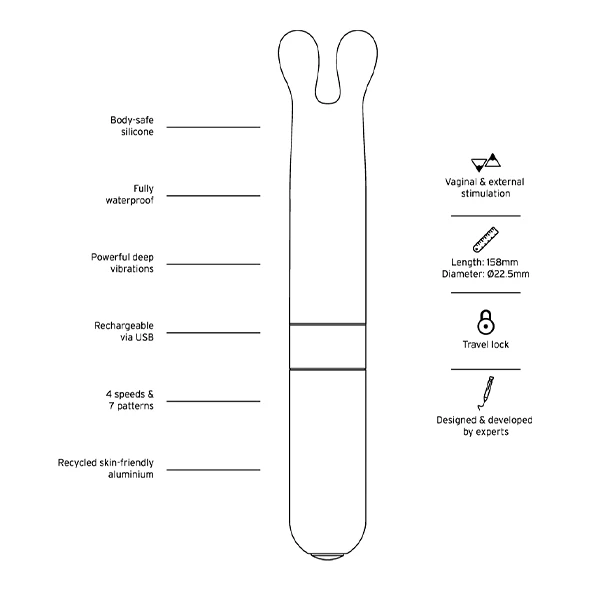 Are you the type of person who can’t make up their mind? Then this twist on the infamous rabbit and classic bullet is for you. It packs all the punch of a larger toy and is perfectly shaped to massage your clit, or hit your g-spot and its smooth silky silicone feels great against nipples. This blended toy with its sculpted ears will bring pleasure to spots you didn’t know needed it.