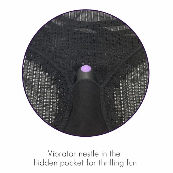 A hidden pocket in the crotch of the lace thong holds the included 10 x function mini vibrator, positioned into a tiny saddle for comfortable and discreet stimulation. Remote control operable up to a range of 10 meters for fun.