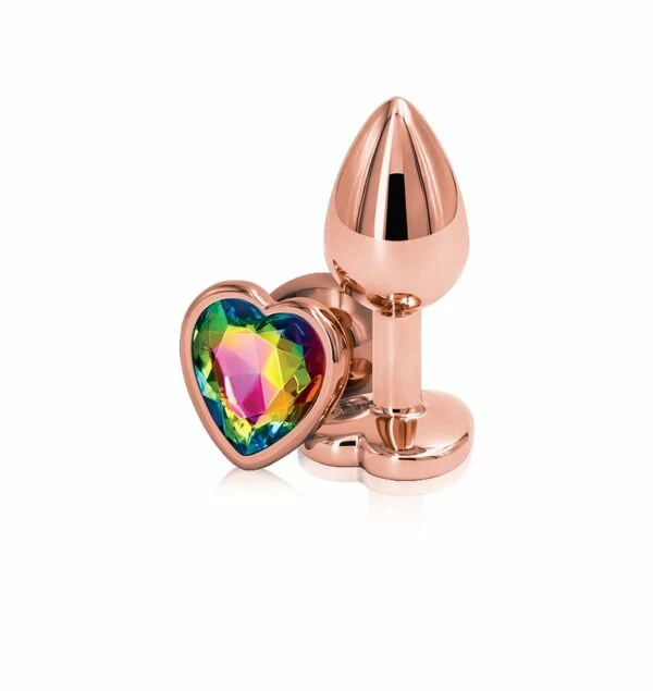 Sit on a throne of stimulation with the Small Rose Gold Rainbow Heart Jewelled Butt Plug by PleasureStore. The rainbow colour certainly lives up to its regal reputation, giving the butt plug a high-quality look which matches the smooth, seamless metal. In place of a crown, the iridescent rainbow heart jewelled base glistens and shimmers as it catches the light.