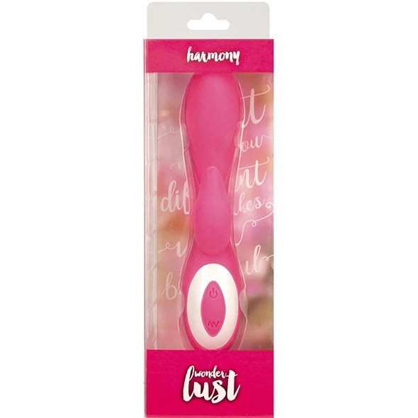 Wonderlust Harmony provides a dual stimulation experience like nothing you have ever felt before. Its hooded external stimulator completely surrounds the clitoris for a fully encompassing vibration, which hits all the right spots. The firm and equally flexible design can also be positioned for added G-Spot stimulation as well. Water-resistant, rechargeable and powered by PowerBullet®, this vibrator truly works in harmony with your needs and desires.